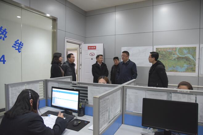 圖為:副市長吳之凌(右二)、市城發(fā)集團黨委書記、董事長談國華(左三),副總經(jīng)理胡振宇(右三),在公司呼叫熱線中心檢查低溫雨雪冰凍天氣供水應急保障工作。